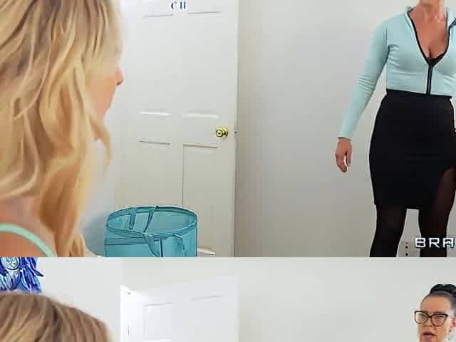 Two teens fucked by lesbian milf dorm manager with a strapon