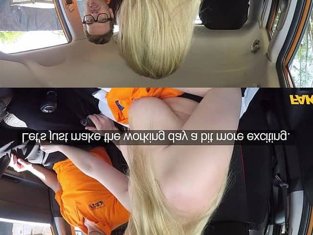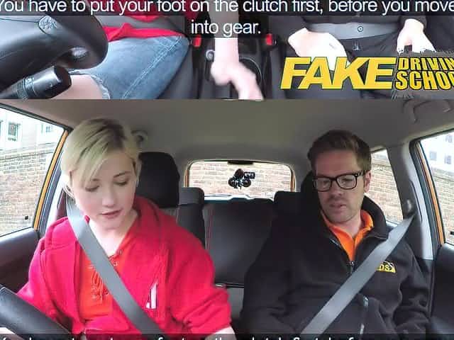 A driving school examiner bangs blonde Barbie Sins in the frontseat