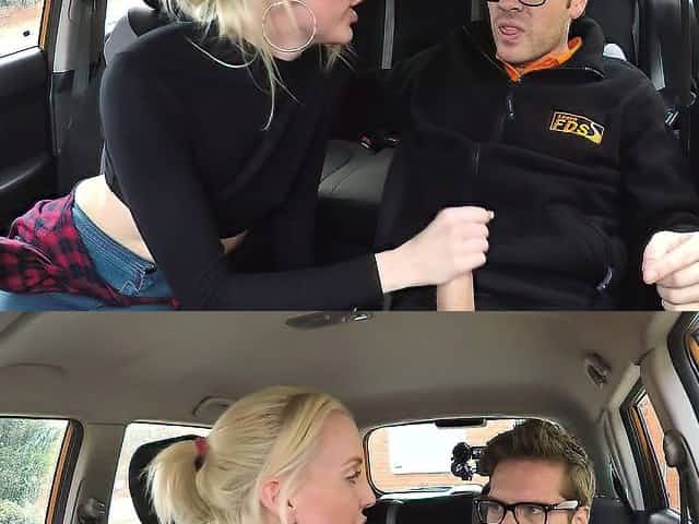 Blonde and driving examiner licking in car