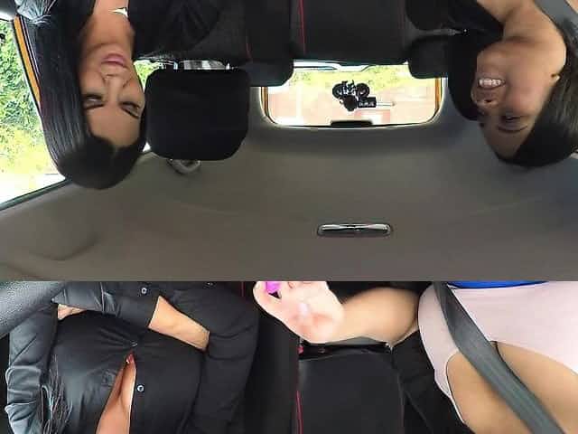 Lesbian sex in fake driving school car
