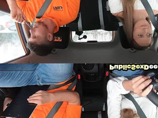 Busty blonde is publicly fucked in a car by a lustful inspector during a driving test.