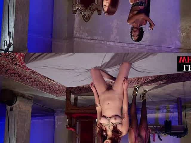 Whipped Asian lez sub with buttplug licks Ebony pussy