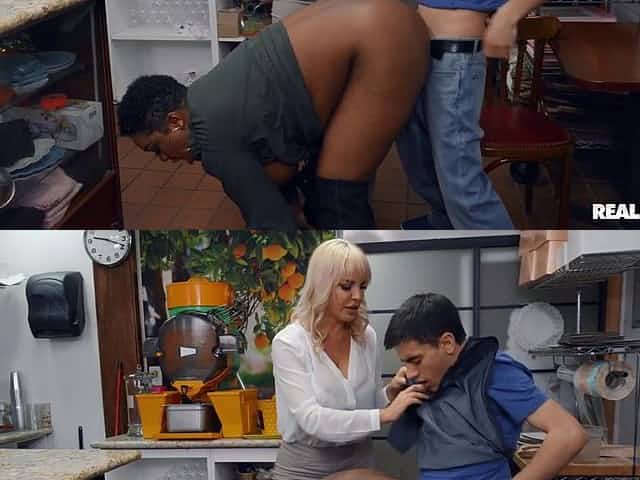 Young barista fucks mature lesbian couple on the floor