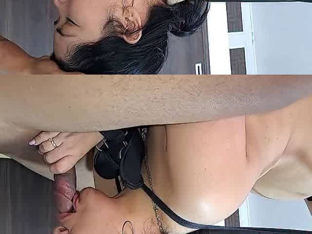My stepmom gives me the best blowjob with a strap-on, its so sexy