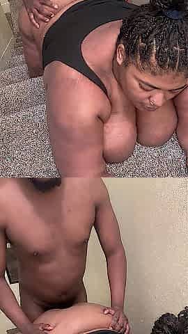 Busty ebony hottie sucking and licking big black boner