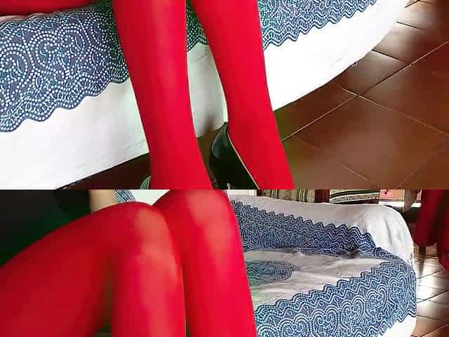 Laura on Heels amateur 2021 wearing red hose and ebony platform high heels