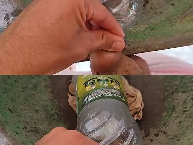 Malleable stick in the disinfectant bottle of the young straight slave