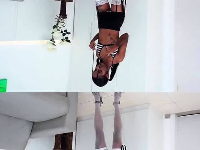Tattooed ladyboy in ebony pants gets her bald booty impaled on the chair