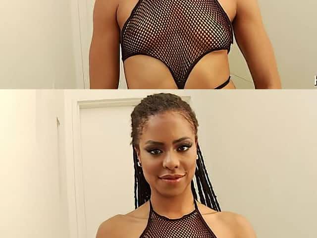 Hot alluring ebony babe bends over to be fucked doggy in hard mode