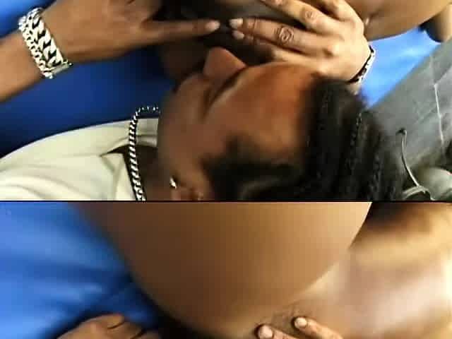 Ebony beauty masturbating and the white guy with large ramrod steer her cunt