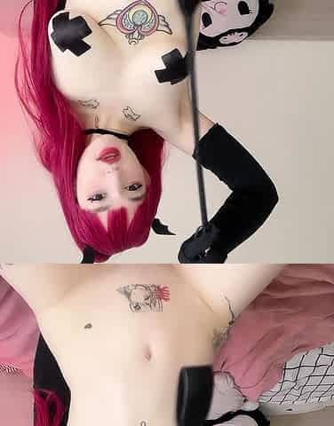 green haired emo angel shows off her buttplug and cums with a toy in her shiny underware