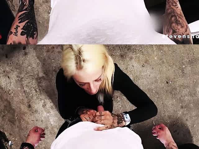 Kitten gives sloppy outdoor fellatio, cum in hair w/ water dump.
