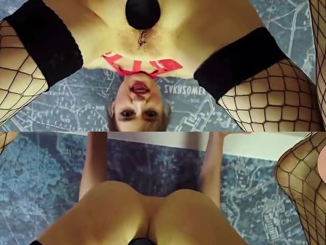 whore with a dick in her throat and sitting with her anus in her dick