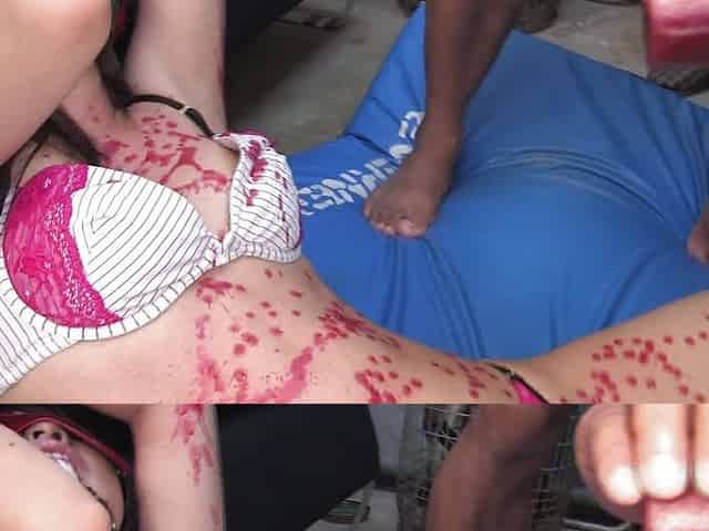 "SKINNY GIRL MOANS IN PLEASURE WHILE GETTING GANG BANGED ON"