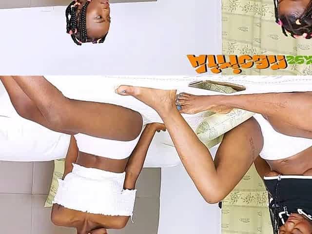 Grace, black teen showing off her hirsute bush and touching herself
