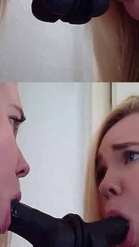Oiled Petite Snowbunny Size Queen Rides Large BBC Dildo