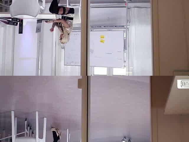 Depraved cuckold wife is nearly caught masturbating in a public water closet