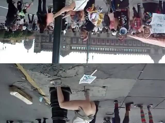 Female agitator pees and poops on a poster at a rally in protest to the government
