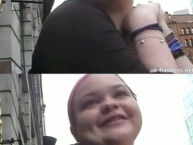 Exhibitionist babe flashes her pussy and massive tits while strolling through the city