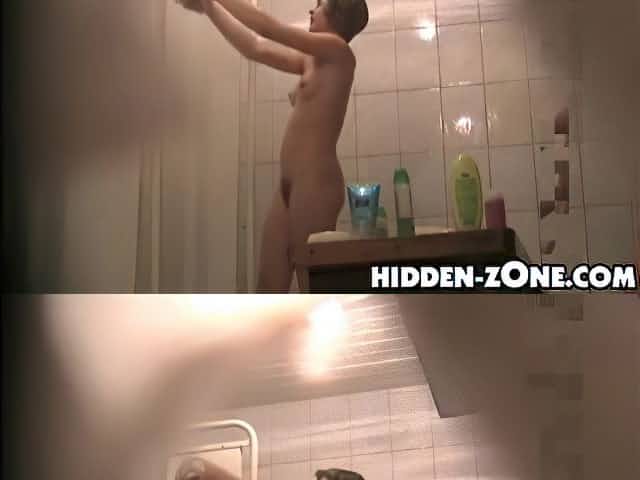Fem flashes bushy nub and tits on hidden shower cam