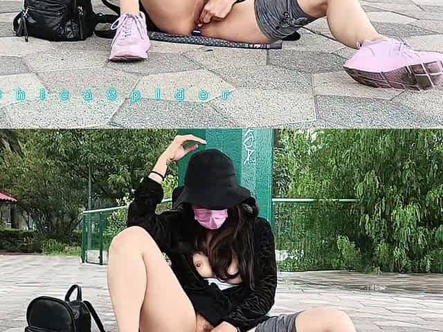 LaChicaSpider se masturba y se viene a chorros en el parque