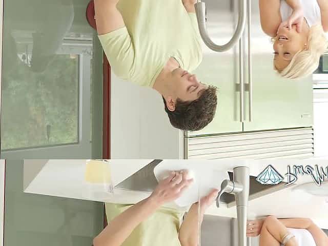 Mamma stands in the kitchen in a belt and fantasies of anal sex