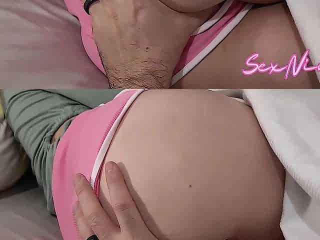 The fat woman with big fake tits gets a titjob from her boyfriend