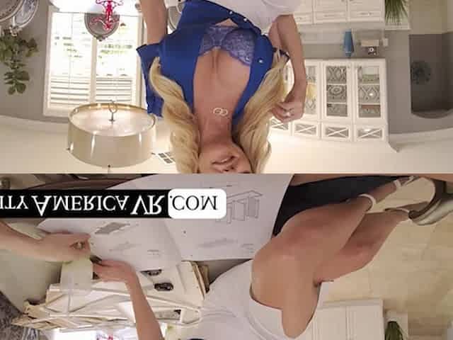 Busty blonde MILF invited over her shy neighbor to ride his fat dick