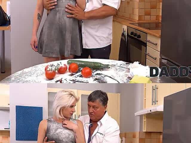 DADDY4K. Old obese man and his sons recent GF entwine bare bodies in kitchen