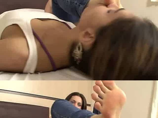 Fitness Beauty does exercises and than does Footjob by her hot lengthy Toes