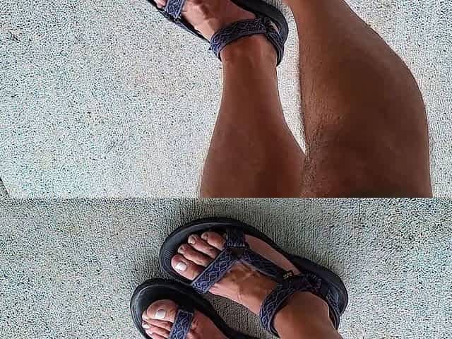 My hunk pedicured feet in sandals
