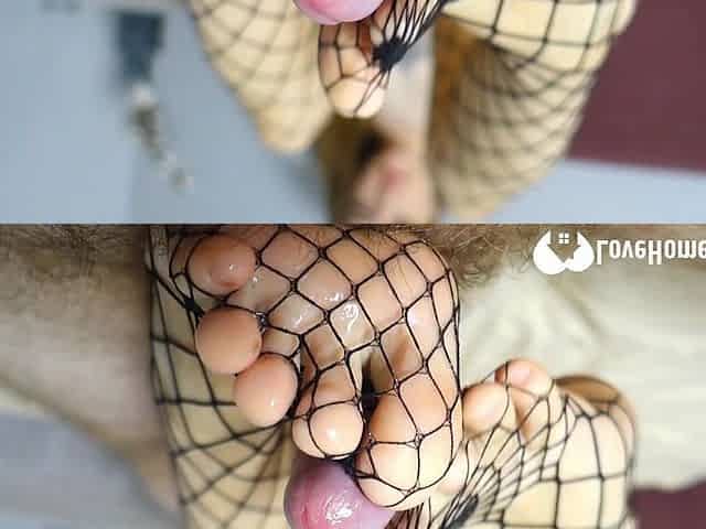 Monique Alexander wearing stockings strokes his monster meat with her feet