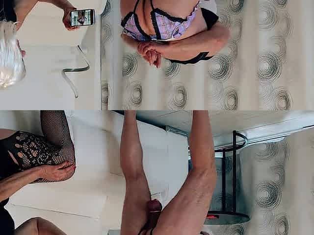 That babe's puzzled about the size of his weenie as this babe jerks him off