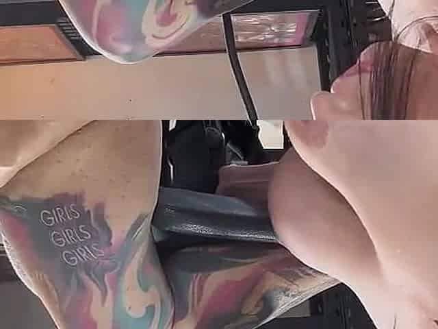Tattooed German lady sitting on her slaves face in the car