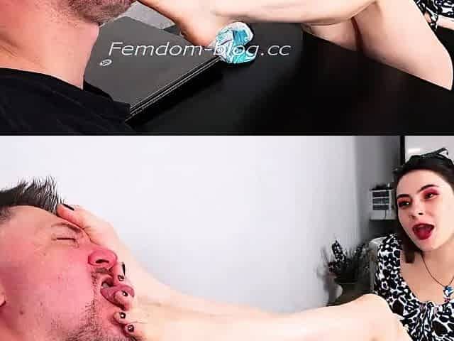 Femdom fetish blonde makes cuckold lick cumshot