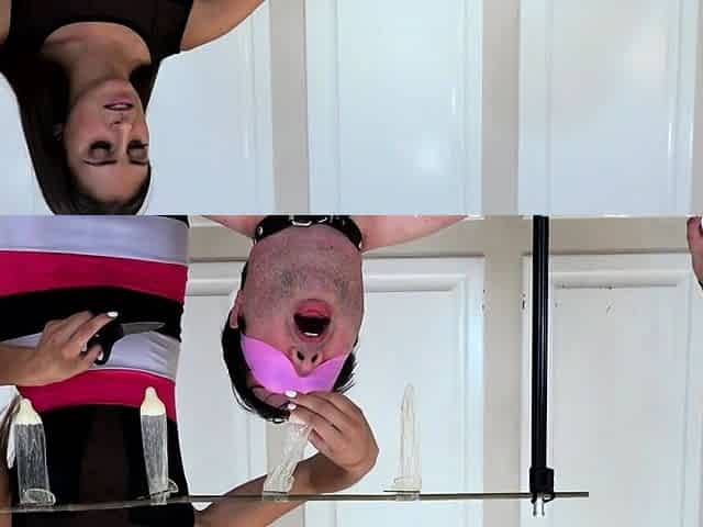 Esposa dominant-bitch a su marido, su sumiso lo folla con un consolador en la boca. Amateur Femdom