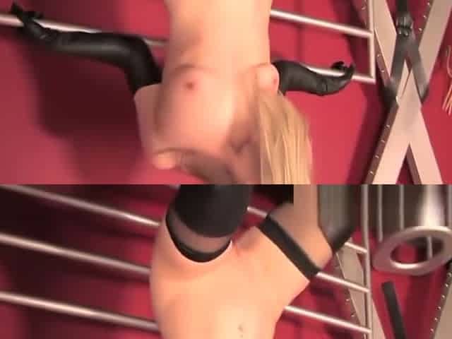 Slutty blonde dominatrix having fun playing with a slave's cock