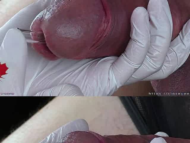 Flawless extraction of semen directly from the urethra. Close-up of the glass straw sounding.