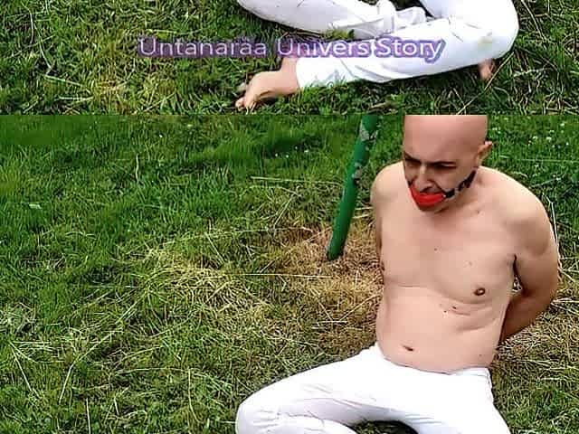 French Goddess voids urine on this chaste and nude inferior being in the garden. VOST engl