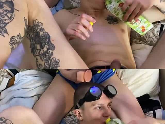 Jerking off his huge cock while fucking his prostate!