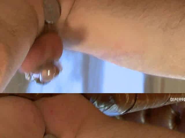 Handsome slave in bondage coping up with cuckold torture in BDSM
