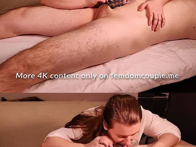 Femdom cuckold with interracial blowjob from brunette