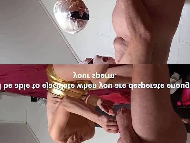 Cuckold locked in cage while hotwife makes film for her lover as she masturbates