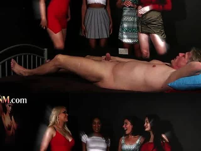 CFNM group of femdom MILFS sucking and jerking guy cock