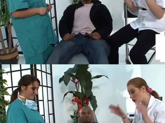 Femdom CFNM nurse babes jerk small cock dude in group