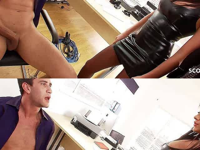 Femdom FFM Threesome Sex for Big Dick Guy by Two Sexy Girls in Office