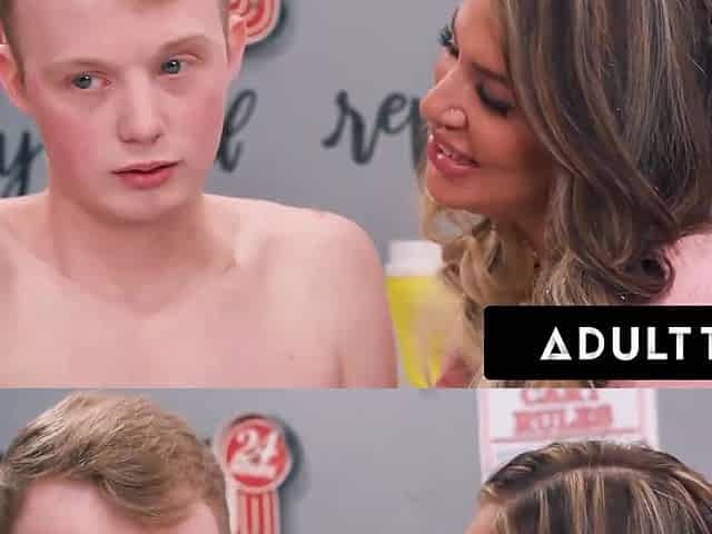 4 amazing MILFs seduce a young teen in a laundry