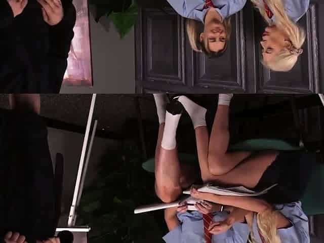 CFNM voyeur teacher watches 3some BJ in her classroom