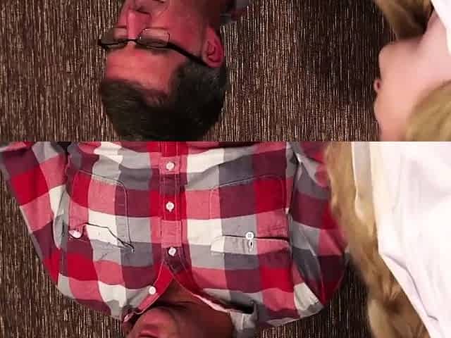 Golden-Haired and brunette hair angels share guy's knob on the floor