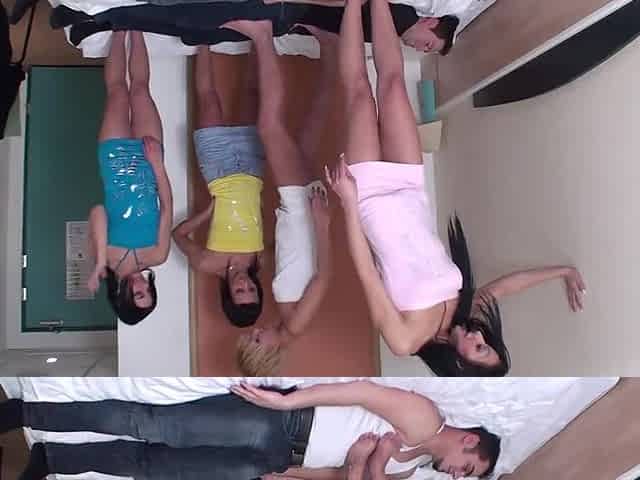 CFNM babes sharing guys dick as they fuck him on the stable